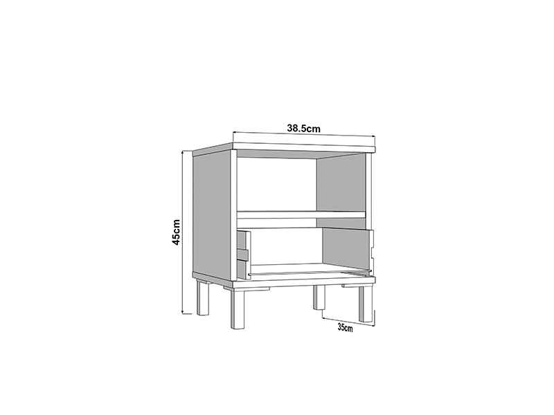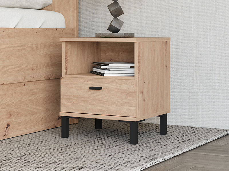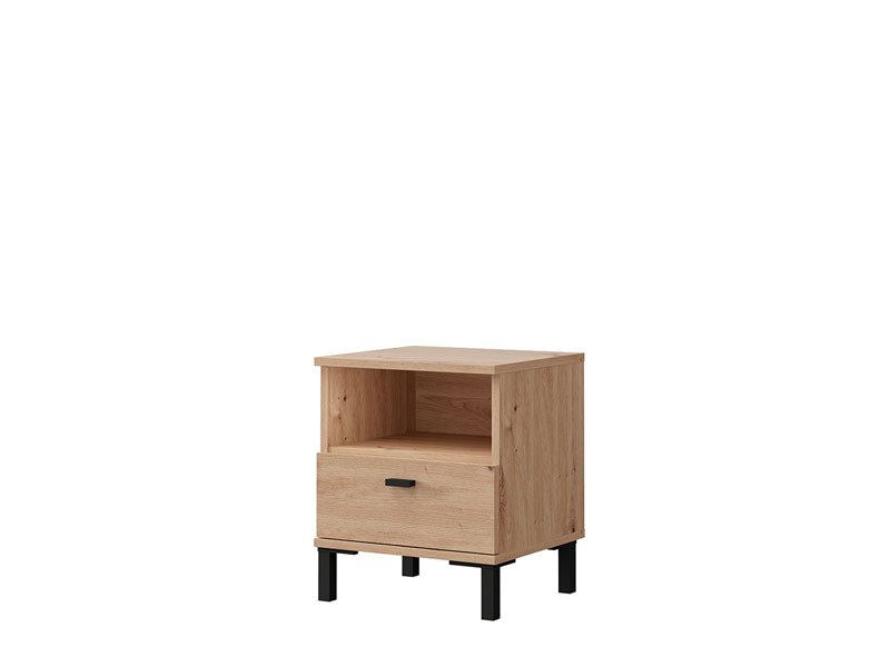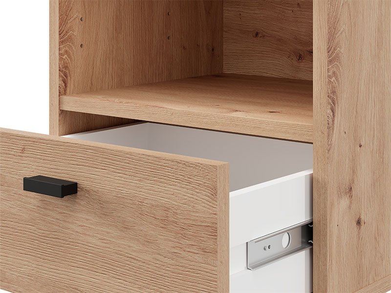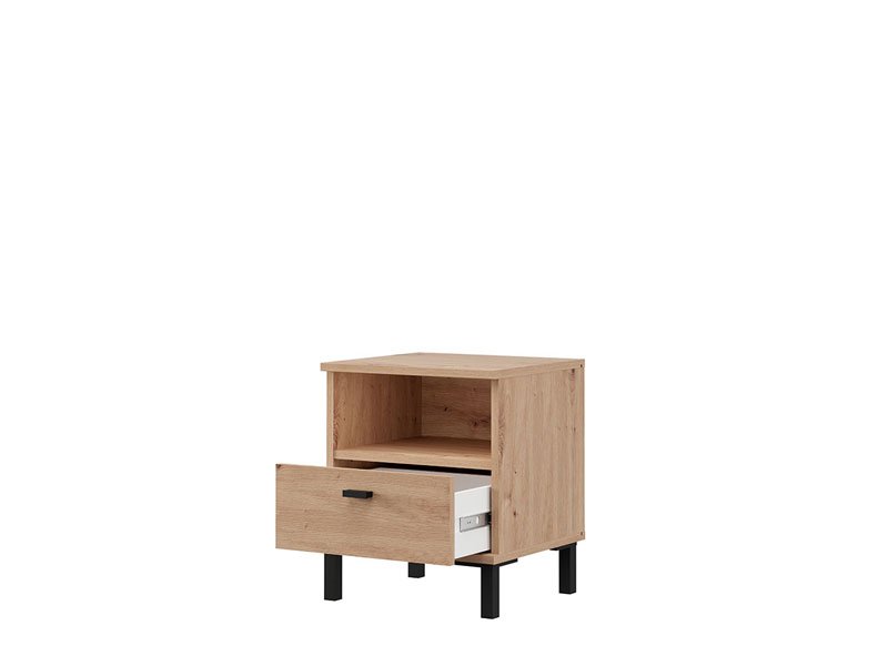 Bedside table BITINIA NO1F, made in a combination of artisan oak and black wood decor, contributes to the warm and modern look of the bedroom, while providing a functional and tidy space next to the bed. The bedside table's usable space consists of one drawer and one open shelf, which enable practical storage of small items and everyday necessities.