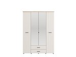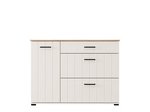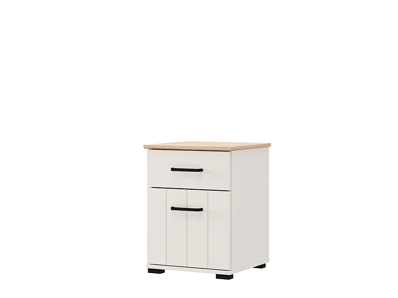 "Bedside table LAMBETH NO1F1V, made in a combination of cashmere and artisan oak decor, contributes to the warm and rustic look of the bedroom, emphasizing a clearly defined geometric design line and embossed stripes on the fronts. Bedside table contains one drawer and one closed partition, providing a practical and tidy space for storing small items next to the bed.
