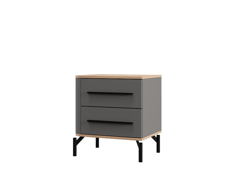 "Bedside table SINOP NO2F, made in a combination of artisan oak decor, artisan oak foil, graphite gray and black wood decor, contributes to the modern and elegant look of the bedroom, emphasizing the contrast and clearly defined geometric design line.