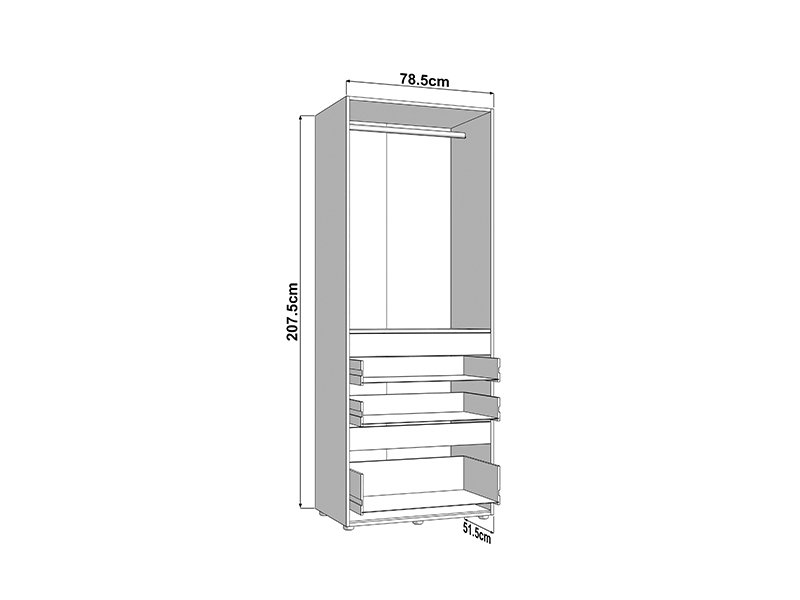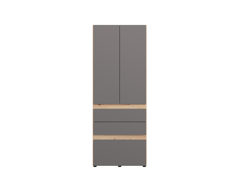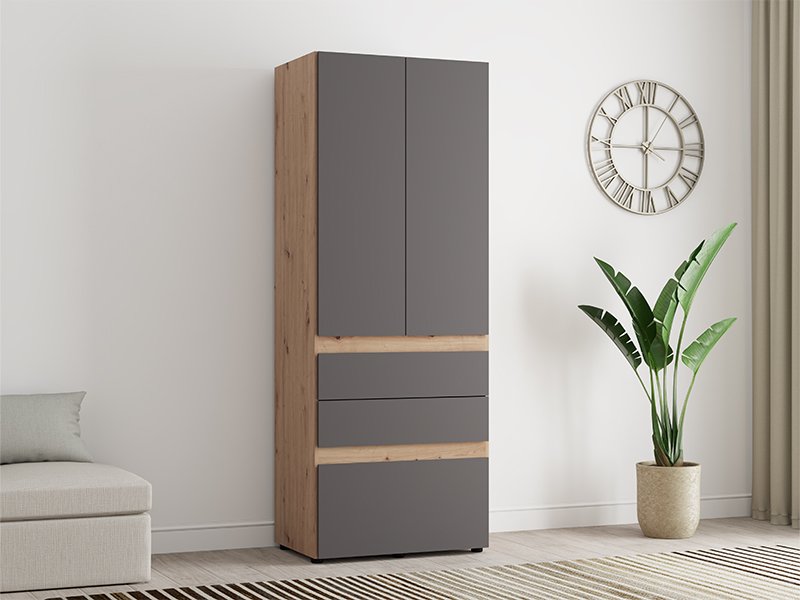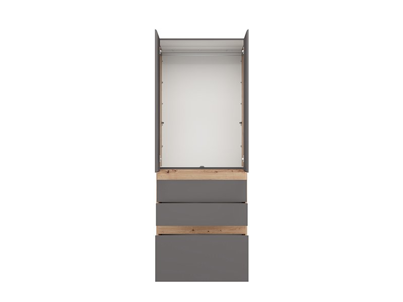 Wardrobe ARDERIN 2K3F h207, combined with artisan oak and graphite gray decor, represents an elegant and modern wardrobe organization solution. The use area includes a double-winged part with a wardrobe rail, under which there are three drawers - two shallower and one deep, which enables a clear and practical organization of clothing and accessories. Wardrobe is designed without visible handles, emphasizing a sophisticated and minimalist look.