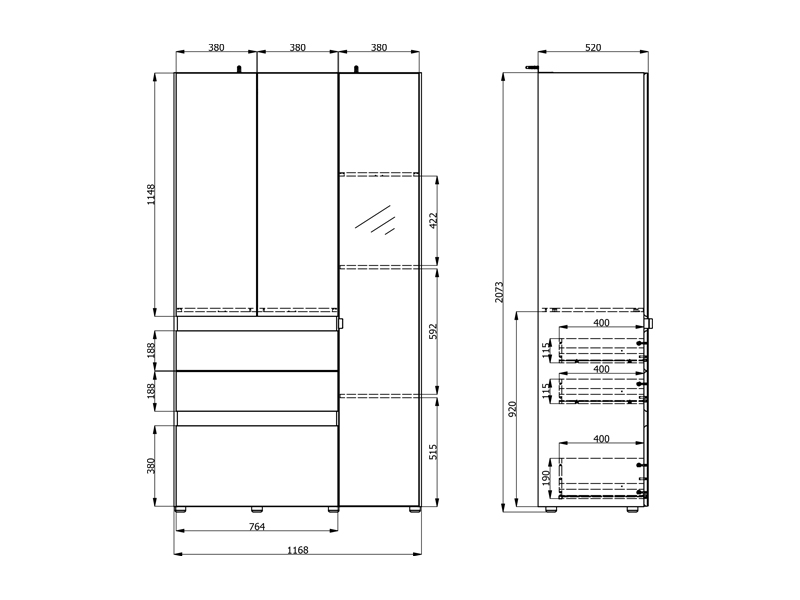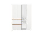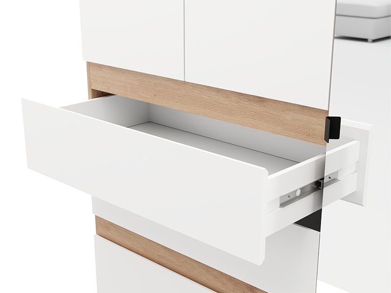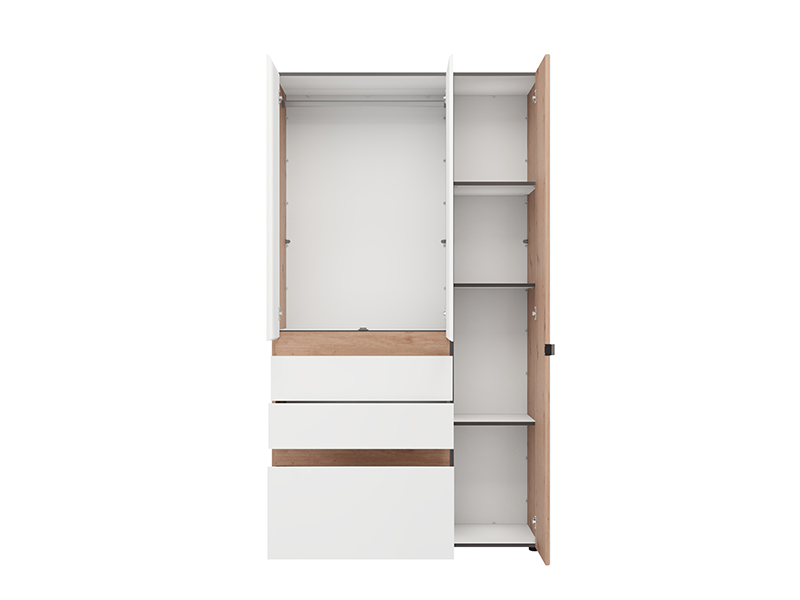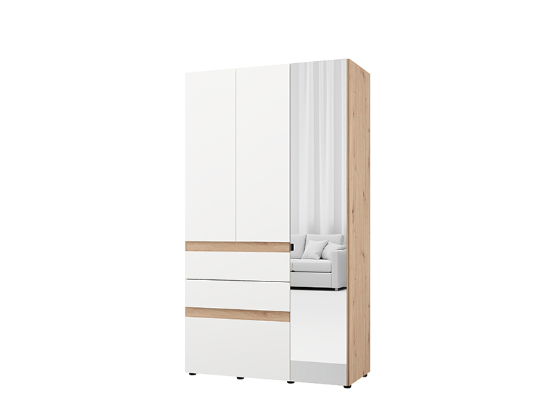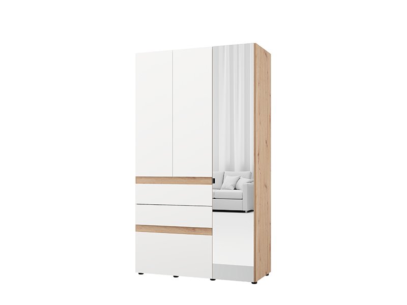 Wardrobe ARDERIN 3K3F1O h207, combined with artisan oak and opaque white decor, represents an elegant and modern wardrobe organization solution. The use area includes a double-winged part with a wardrobe rail, under which there are three drawers – two shallower and one deep, as well as one partition behind the front with a mirror, allowing for a transparent and practical organization of clothing and accessories. There is an option to add a set of shelves for additional functionality of the interior space.