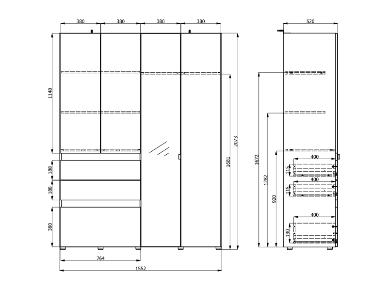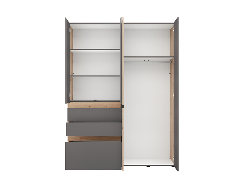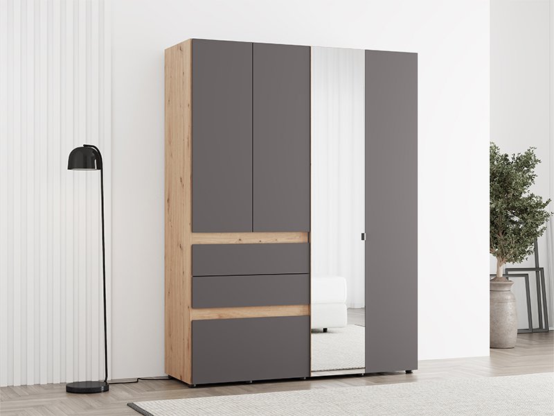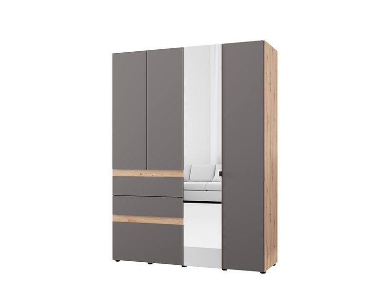 Wardrobe ARDERIN 4K3F1O h207, combined with artisan oak and graphite gray decor, represents an elegant and modern wardrobe organization solution. The use area includes a double-winged part with shelves, under which there are three drawers, and a double-winged part with a wardrobe rail. One side of this four-part cupboard has a mirror, and there is also the possibility of adding a set of shelves for additional functionality of the interior space.