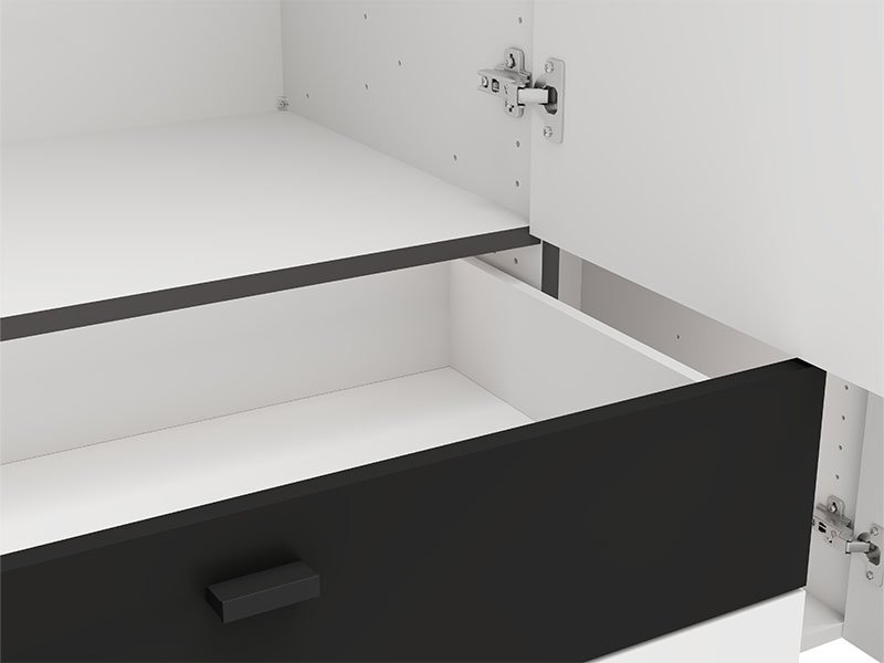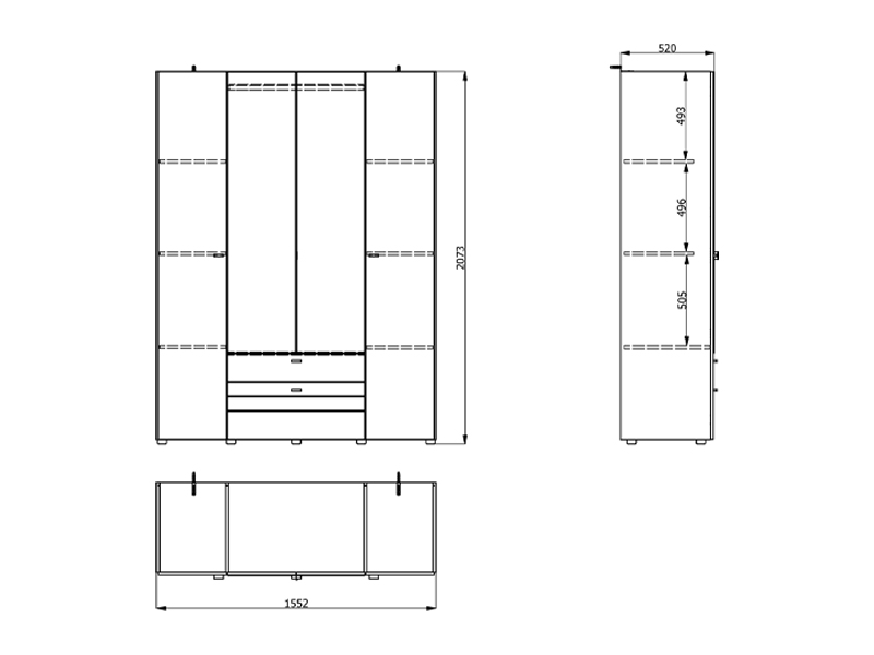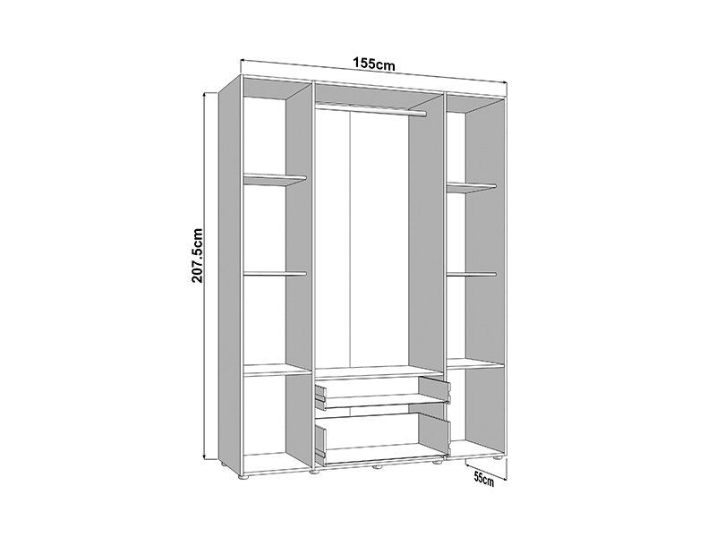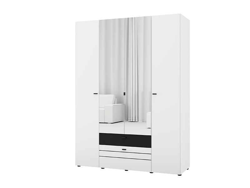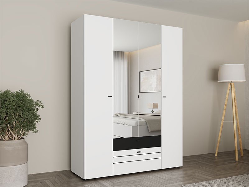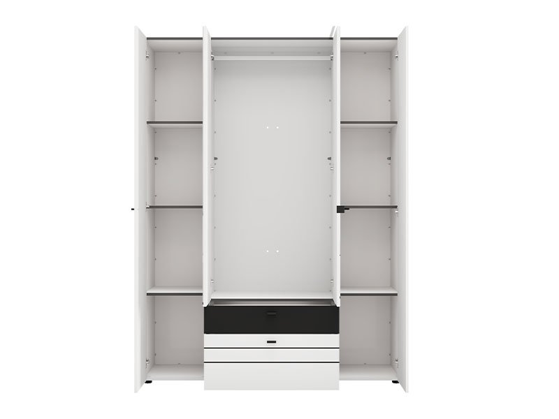 usable space of the four-wing cupboard is organized through the central part with a wardrobe rail for storing clothes, while the left and right parts represent closed partition segments, intended for tidy storage of the wardrobes and accessories. In addition, Cupboard has two drawers for smaller items.