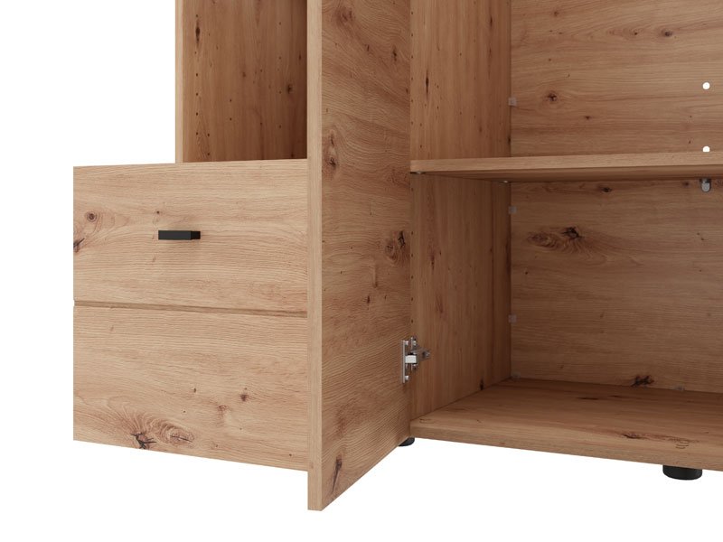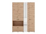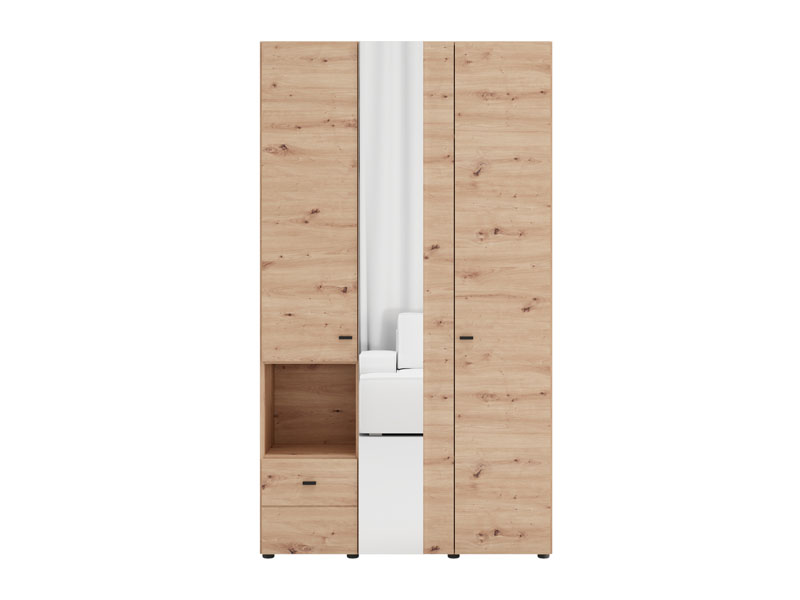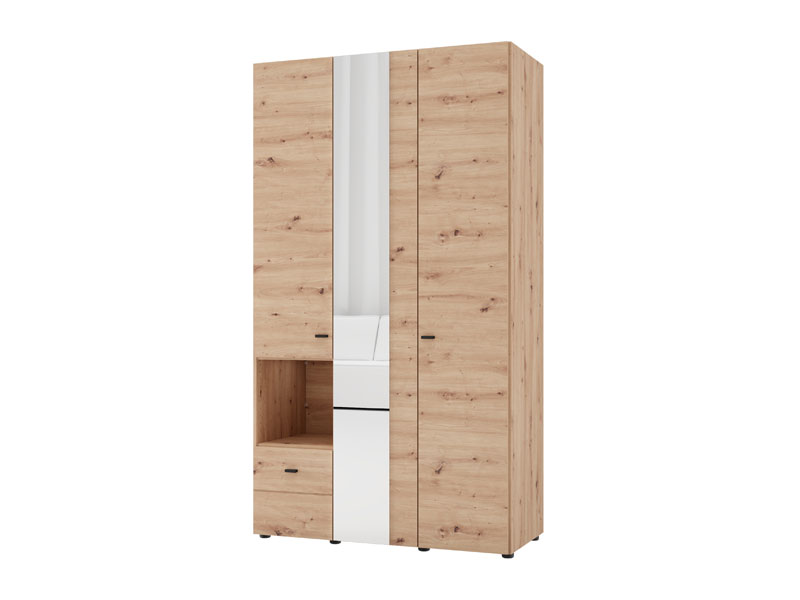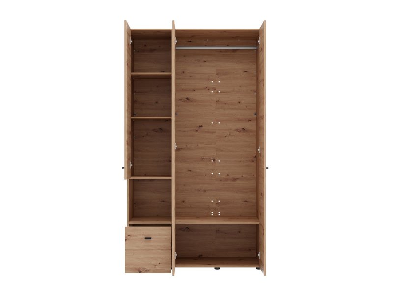 Wardrobe CAMPSIE 3K1F1O h207, in artisan oak decor, represents a modern and elegant solution for wardrobe organization. This three-part Cupboard has one mirrored section that contains shelves, an open shelf and a deep drawer, while the remaining two parts include a wardrobe rail, allowing for a transparent and practical organization of clothing and accessories. The usable space can be further expanded by adding a set of shelves, increasing the functionality of the wardrobe.