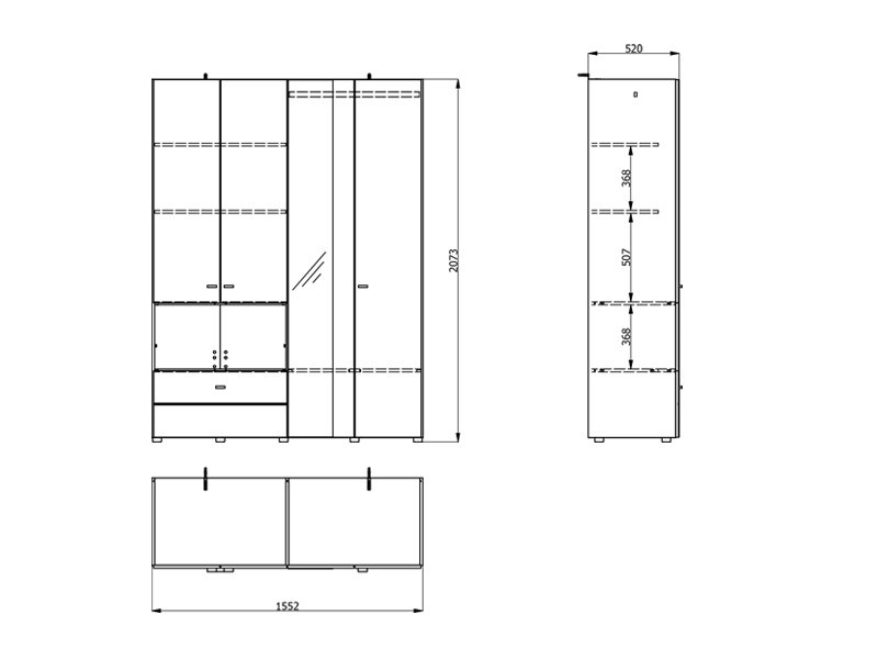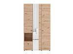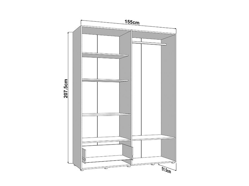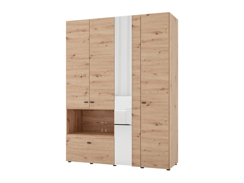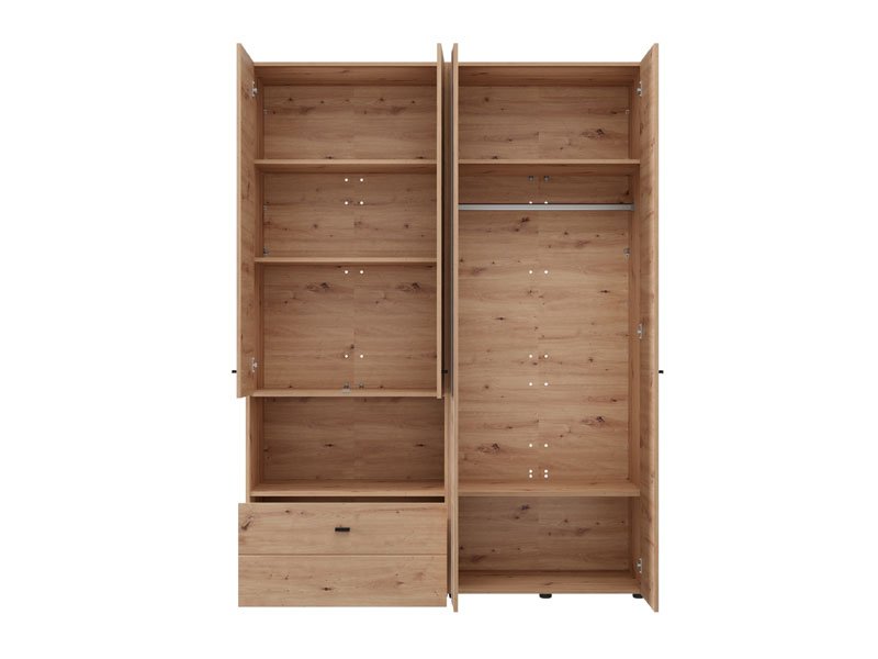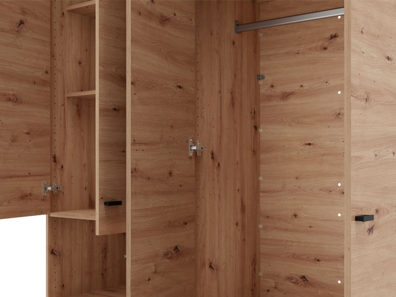 Wardrobe CAMPSIE 4K1F1O h207, in artisan oak decor, represents a modern and elegant solution for wardrobe organization. This four-part wardrobe has one two part section with shelves, one open shelf and one deep drawer, while the other two-part section contains a wardrobe rail. One door of the cupboard has a mirror, which contributes to the practicality, but also to the aesthetic impression of the space. The usable space can be further expanded by adding a set of shelves, increasing the functionality of the interior.