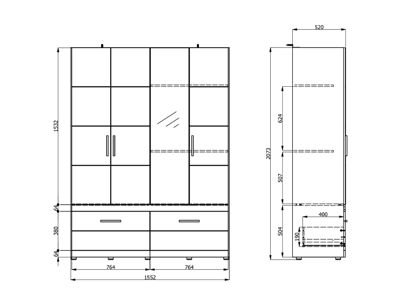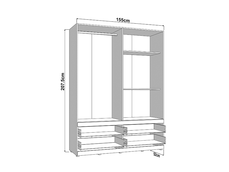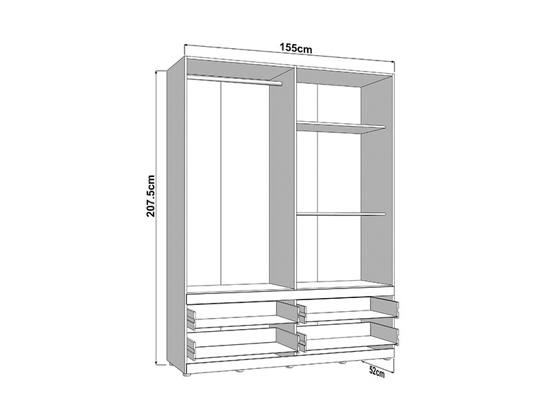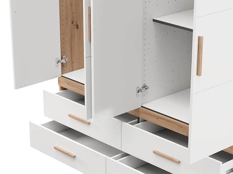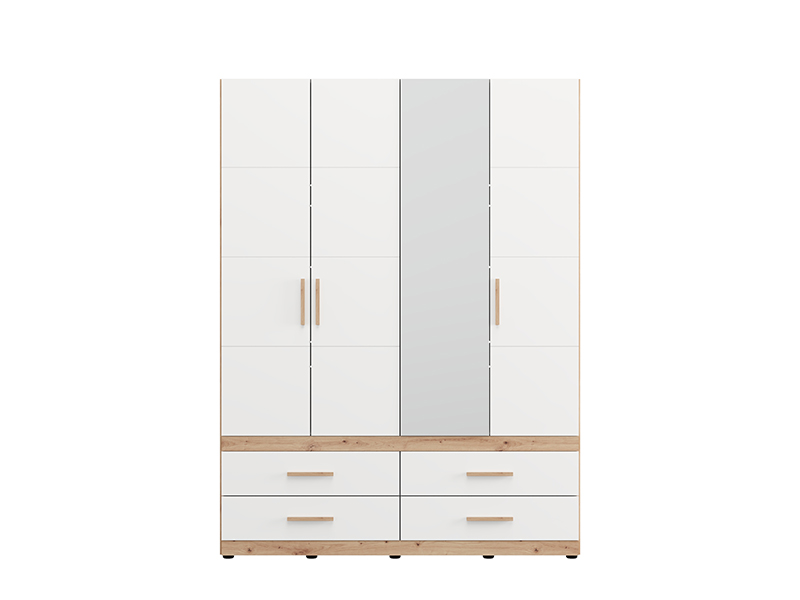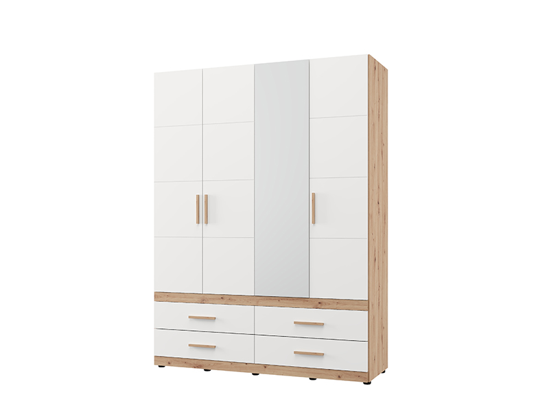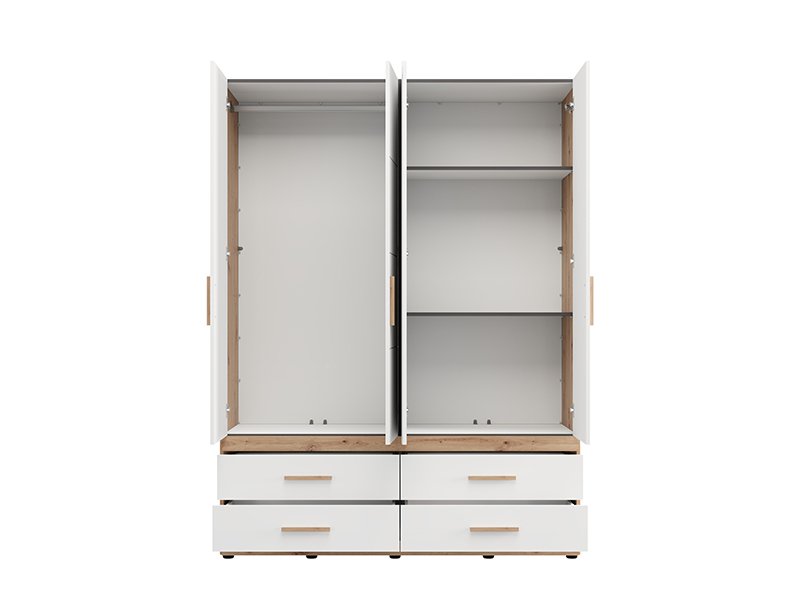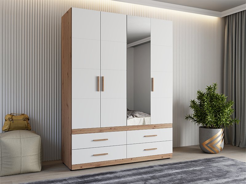 Wardrobe DILLON 4K4F1O h207, combined with artisan oak and opaque white decor, is a functional and elegant wardrobe organization solution. The usable area consists of two double-winged parts - one part with a wardrobe rail and the other part with partitions. Under the closed parts there are four spacious drawers, two under each double-winged part, allowing a clear and practical organization of clothing and accessories. On one of the fronts there is a mirror, which contributes to the practicality and aesthetic impression of the space. The usable space can be further expanded by adding a set of shelves for even greater functionality.