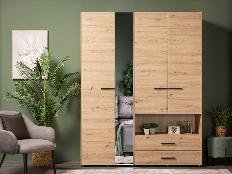 Wardrobe LEON 4K2FO, in artisan oak pattern, with wardrobe rail on the left side, as well as double closed shelves, one open shelf and two drawers on the right side, will functionally contribute to the organization of the ambience. The mirror on the central part of the LEON 4K2FO wardrobe will aesthetically enrich and visually increase the ambience of the living space in which it is located.
