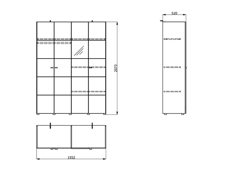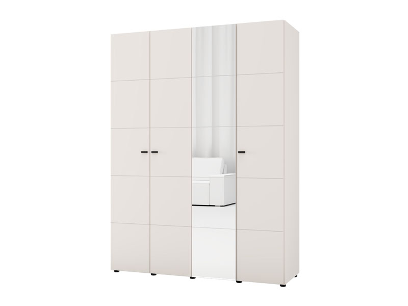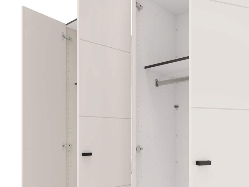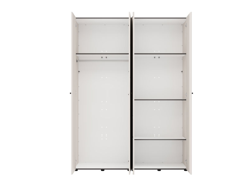 In its basic form, the usable space of the four-wing cupboard is organized through one double-winged part with a wardrobe rail for storing clothes, as well as another double-winged part with shelves, which allows for tidy storage of wardrobe and accessories. There is a possibility of additionally installing a set of shelves for even better adaptability and organization of space.