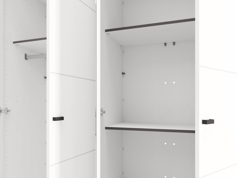 Wardrobe SALAMIS 200 OG h205, made in an elegant opaque white decor, contributes to the calm and sophisticated look of the bedroom. In its basic form, the usable space of the wardrobe consists of two wardrobe rails, which enable a tidy and practical storage of the wardrobe.