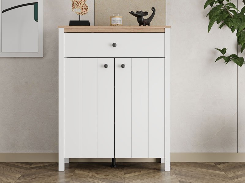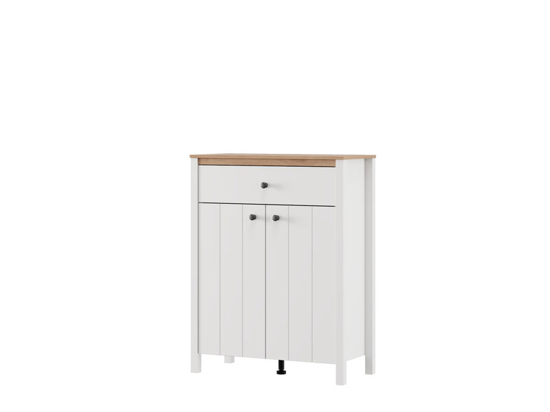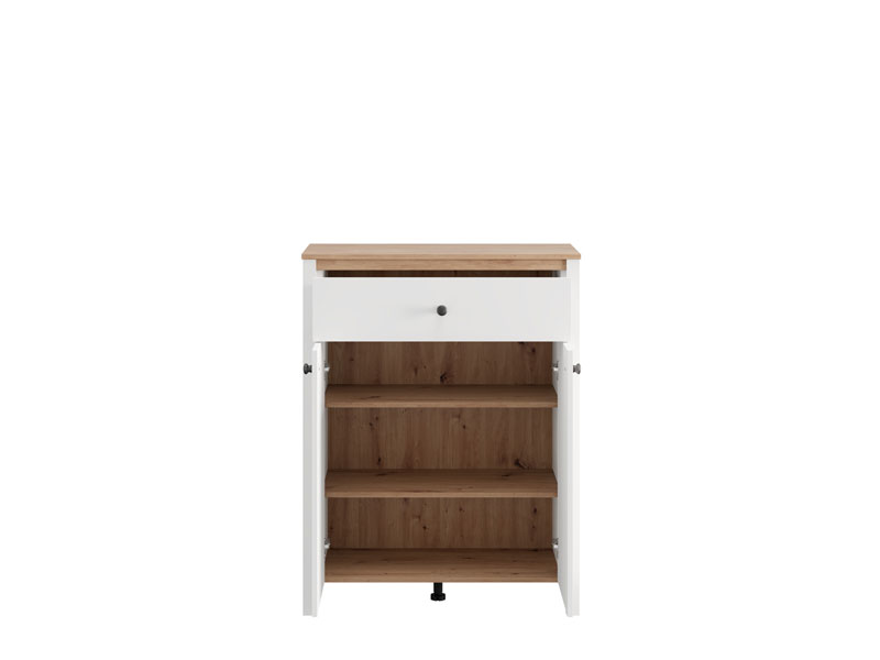Hall unit element BEDFORD 2K1F2V, in combination of an opaque white decor, artisan oak, white matte foil and artisan oak foil, offers a practical double-winged closed partition for storage, as well as one drawer for smaller items. This element can be in combination of other parts of the BEDFORD collection, allowing a functional and harmonious organization of the entrance area.