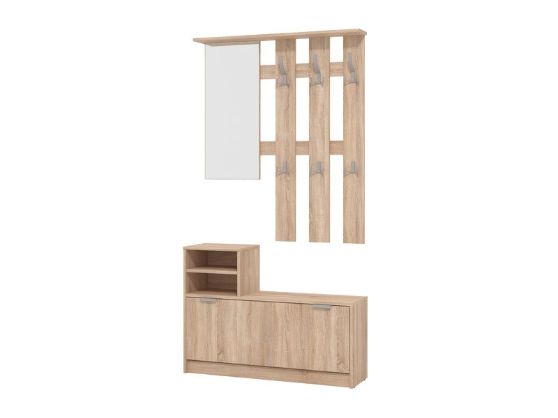 The RAVENNA hall unit, in an artisan oak pattern, consists of two practical parts that will help you store your favorite shoes and clothes adequately. The upper part, which is mounted on the wall, contains hooks and a mirror, while the lower part has two open shelves and a closed segment for storing shoes.