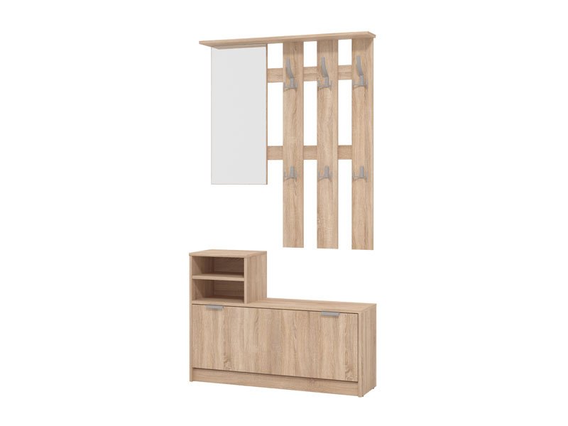 The hall unit RAVENNA consists of two segments. The top segment which is hung on the wall contains hangers and a mirror, while the base segment is closed and intended for storing footwear.