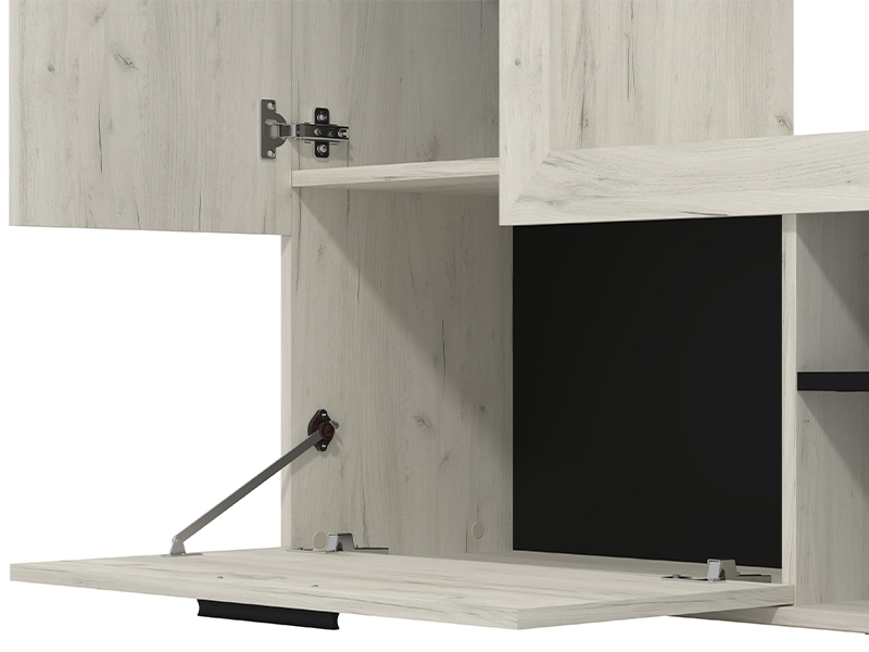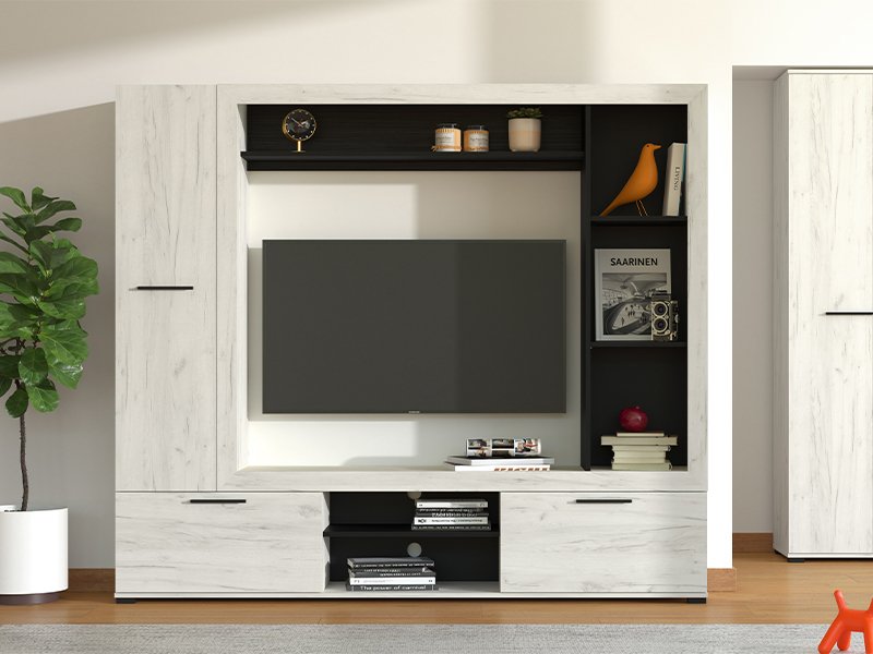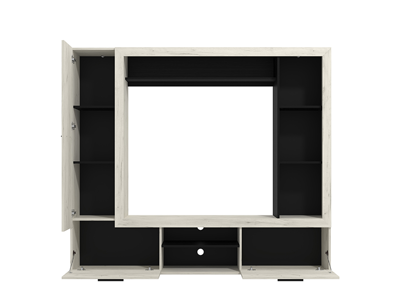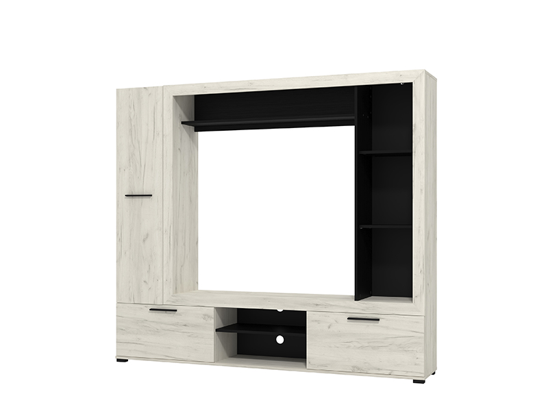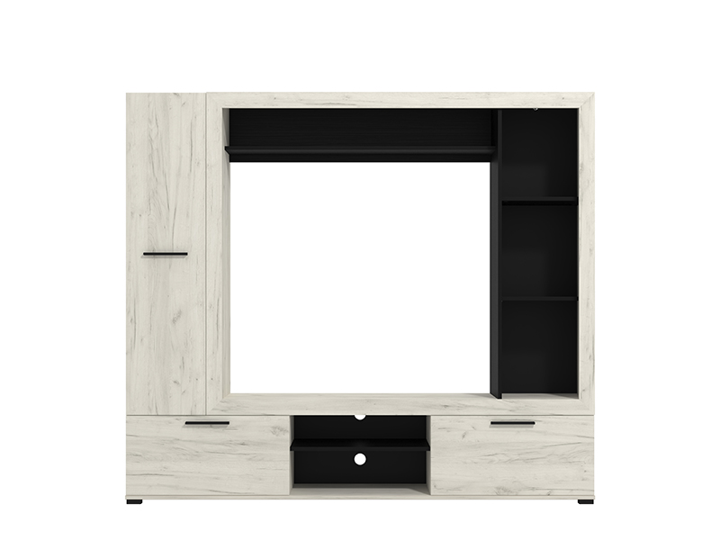 The LORCA Entertainment Center in décor of white oak and black wood is a compact model of the Entertainment Center designed for modern environments. It consists of a combination of open and closed shelves and is suitable for audio-visual devices as well as for décor and disposal of necessary items. The recommendation is to combine it with a practical double lattice cupboard of the same design and style line LORCA 2K .