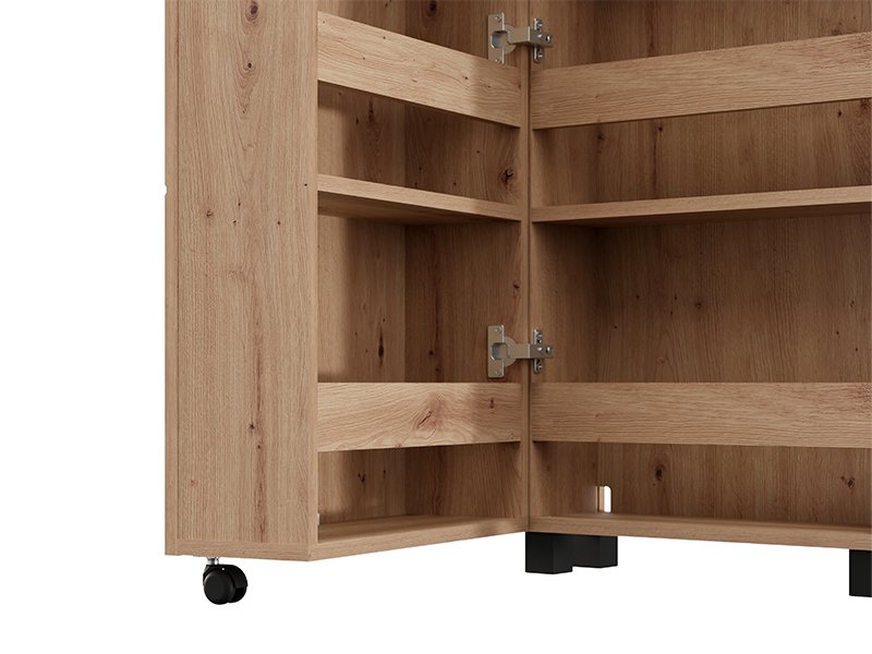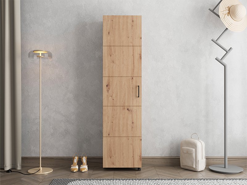 Shoe cabinet ISLAY 46 1K h185, in the decor of artisan oak with hotstamping stripes, is a practical and elegant solution for the hallway. The interior of this single-winged shoe cabinet with closed shelves provides a neat and functional organization of footwear.