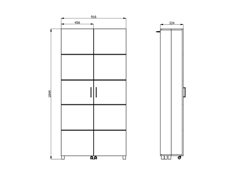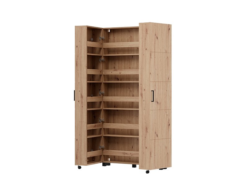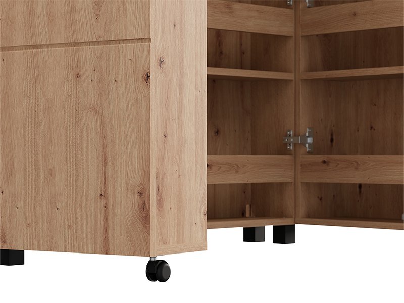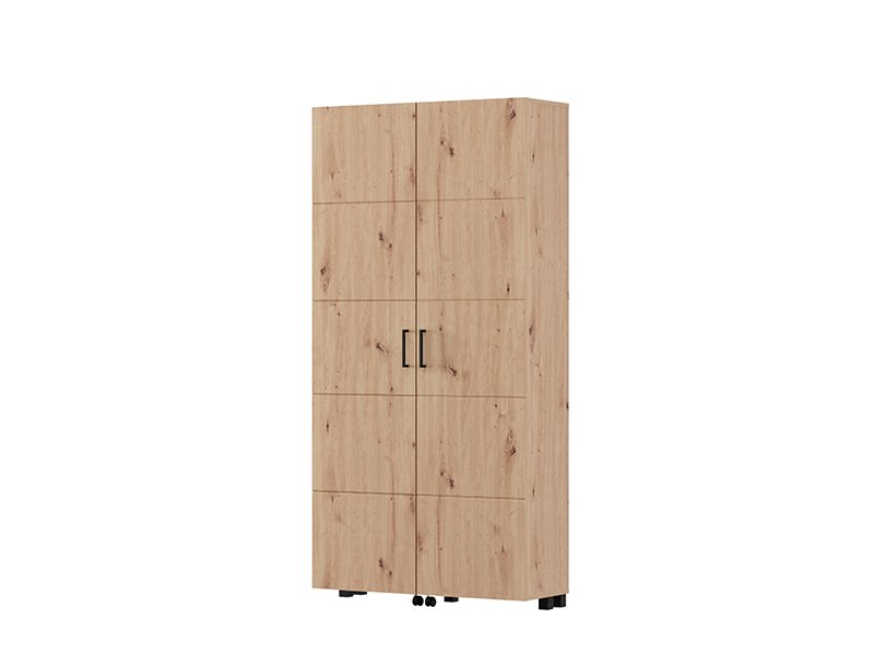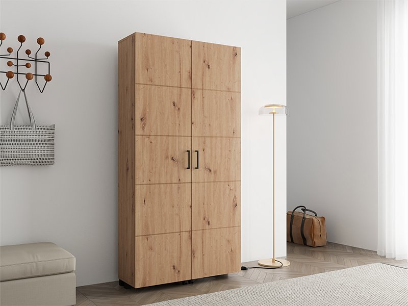 Shoe cabinet ISLAY 91 2K h185, in the decor of artisan oak with hotstamping stripes on the front, is a practical and elegant solution for the hallway. The interior of this two-winged shoe cabinet with closed shelves enables a functional and neat organization of footwear.