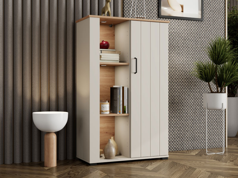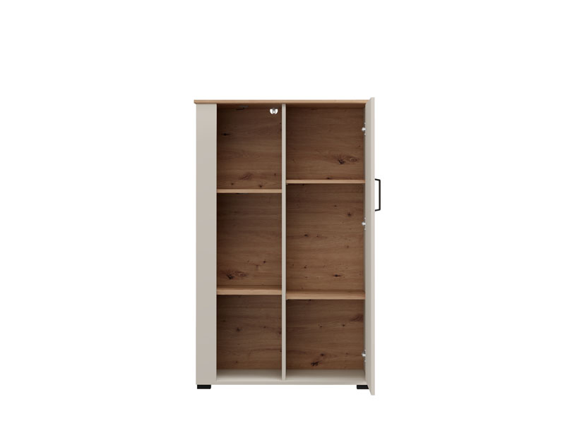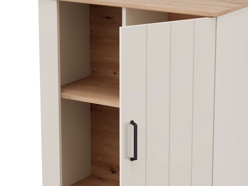 Entertainment center LAMBETH 2K1V 127 in a combination of cashmere decor and artisan oak brings warmth and rustic character to the space, thanks to a special finish in the form of stripes embossed on the fronts. The usable space consists of two closed and one open partition, within which there are practical shelves for organized disposal of usable and decorative items. The entertainment center LAMBETH 2K1V 127 is part of the system of elements LAMBETH, which is characterized by aesthetically pronounced style and functionality. There is an option of installing additional LED lighting, which further emphasizes and illuminates the space.