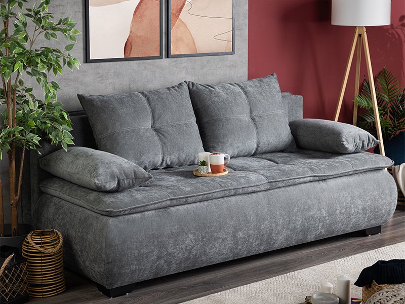 Exact fabric name: seat/backrest/large cushion/small cushion, fabric WIND 89 dark gray. The MINA sofa, in addition to its very attractive and modern design and fabric, has very practical features and fully meets the needs of modern living spaces. The storage box for bedding contributes to its functionality, and the useful surface for rest and sleep with dimensions of 150x198 cm adds extra comfort to this bed model.