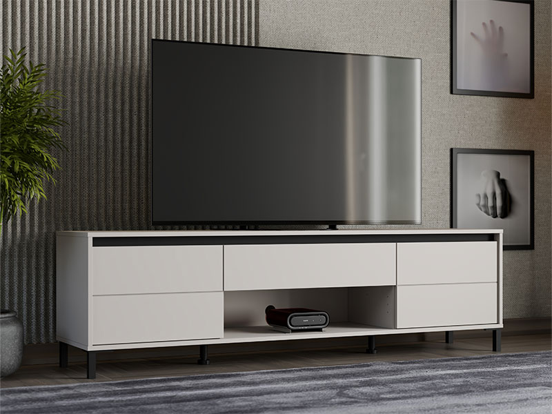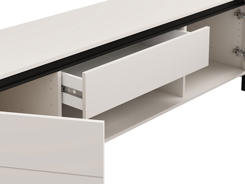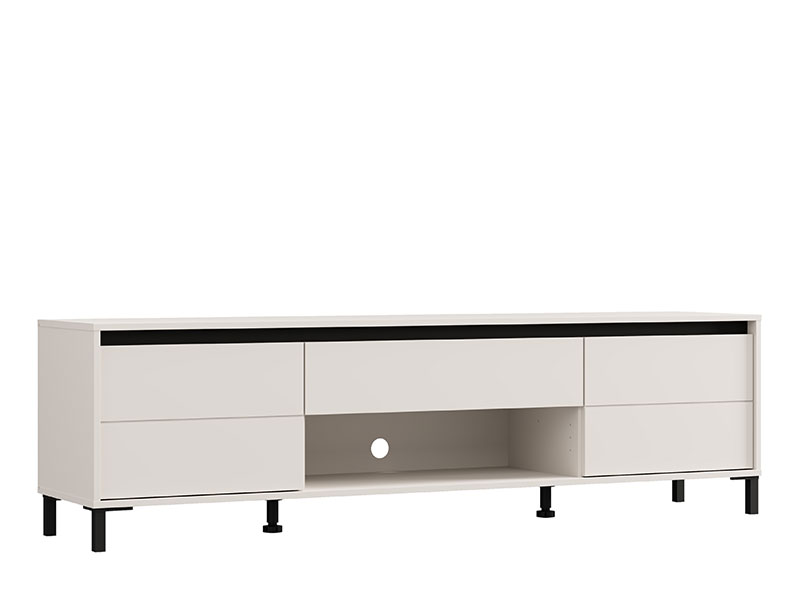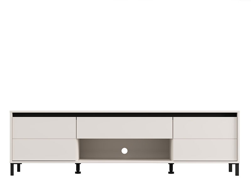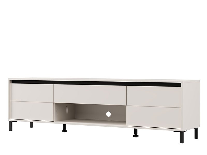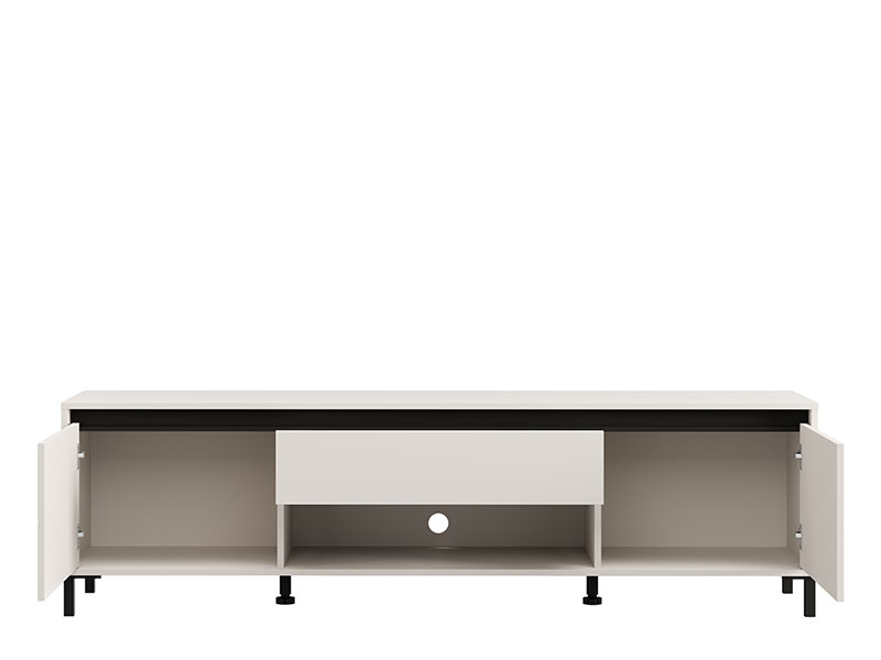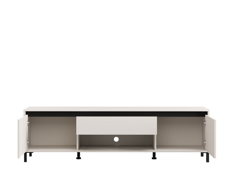 TV shelf MARRON TV 183 3K1F2V in a combination of cashmere decor and black matte foil brings a modern visual contrast and sophisticated warmth to the space. The usable space consists of two closed partitions, one open shelf and one drawer, which enable practical and organized disposal. TV shelf MARRON TV 183 3K1F2V is part of the system of elements MARRON, which is characterized by the harmony of modern tones and the functionality of contemporary design.