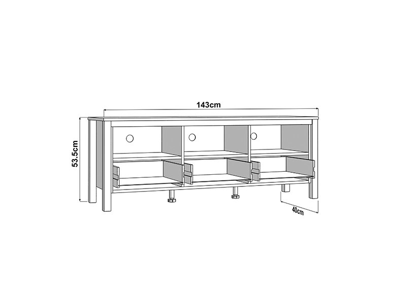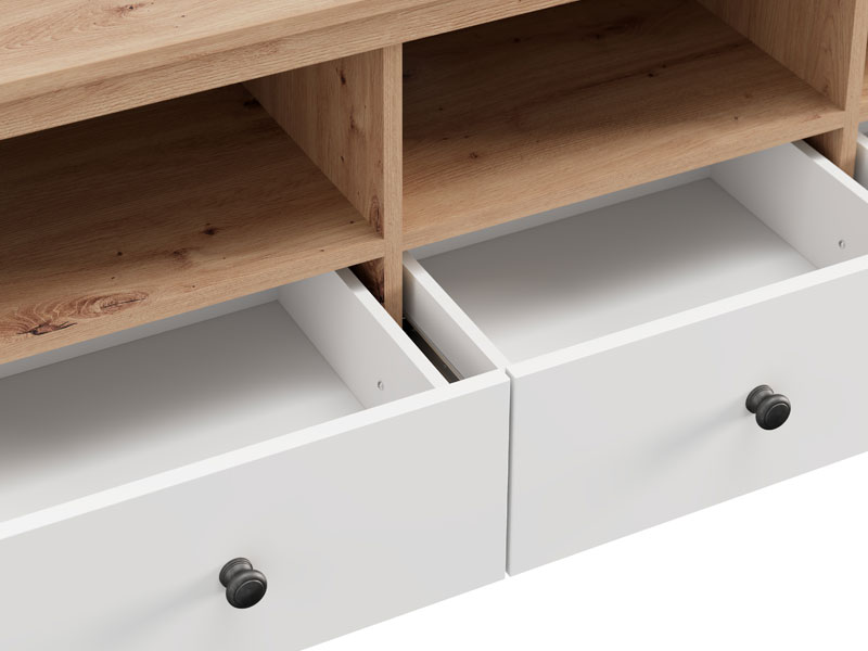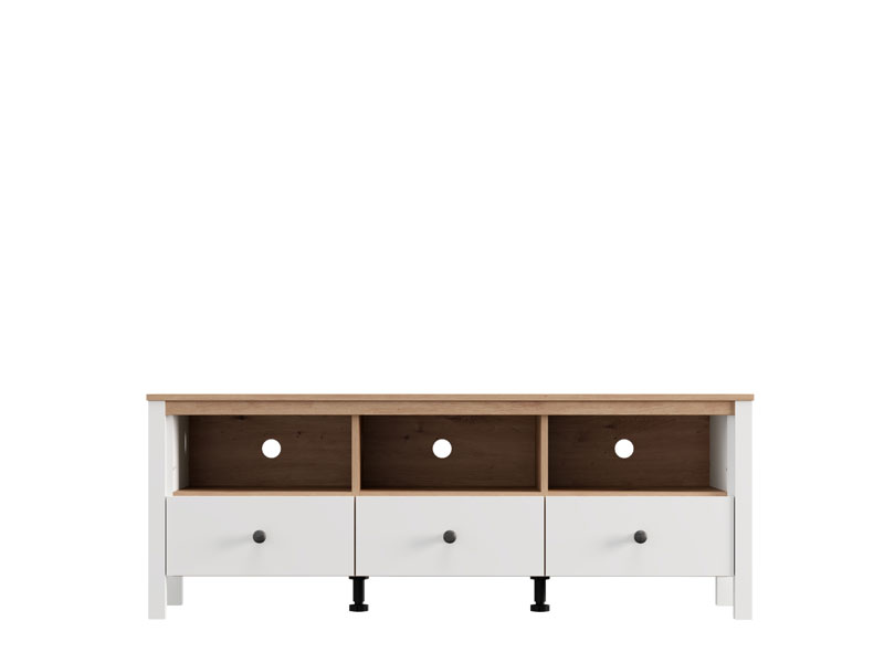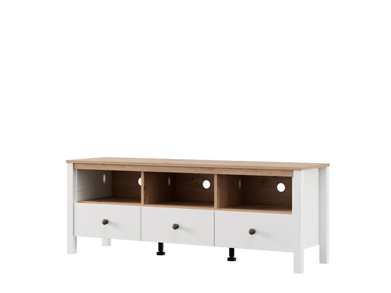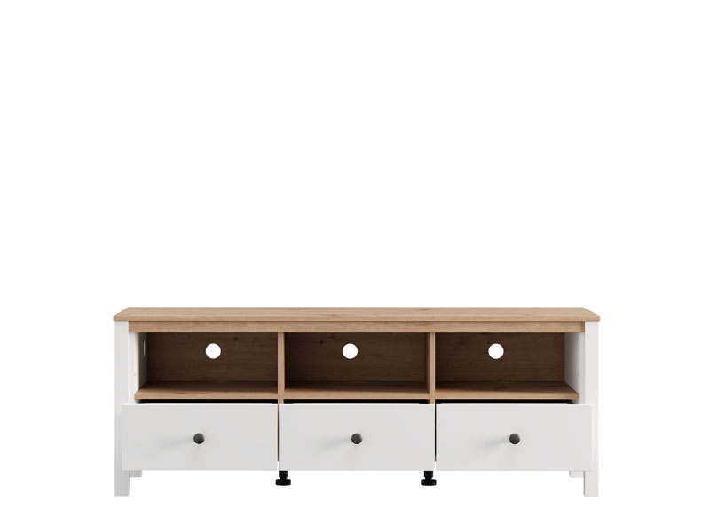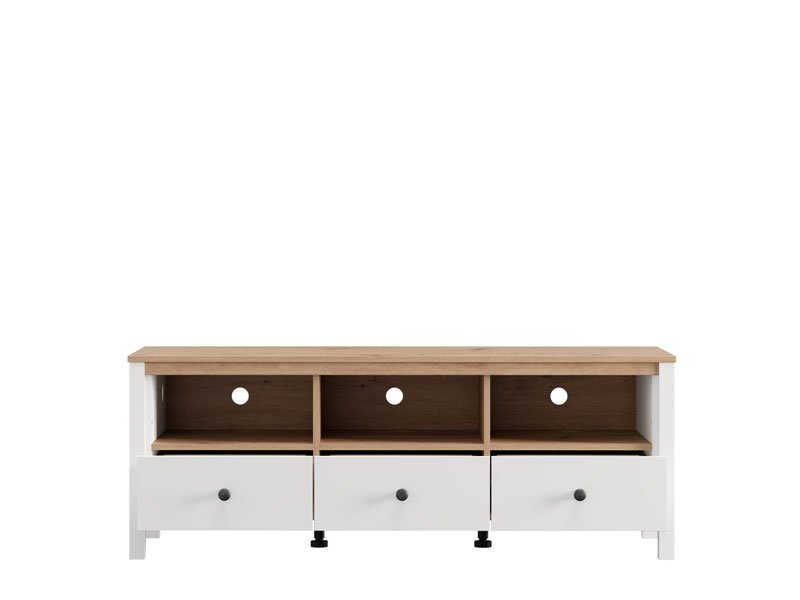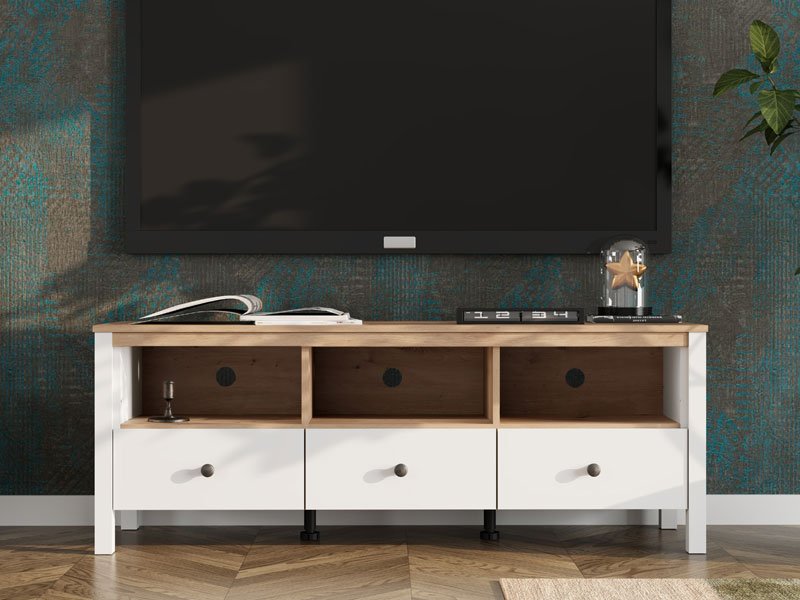 TV shelf BEDFORD TV 143 3K3F combines opaque white decor, artisan oak, white matte foil and artisan oak foil to bring warmth, elegance and natural charm to the space. The usable space consists of three open partitions and three drawers, which enable practical and organized disposal of media devices, books and decorative items. TV shelf BEDFORD TV 143 3K3F is part of the system of elements BEDFORD, which features a blend of rustic aesthetics and functional, modern design.