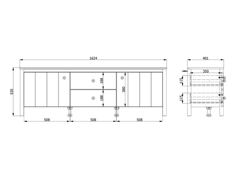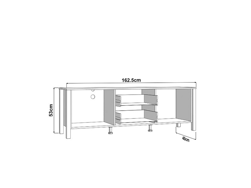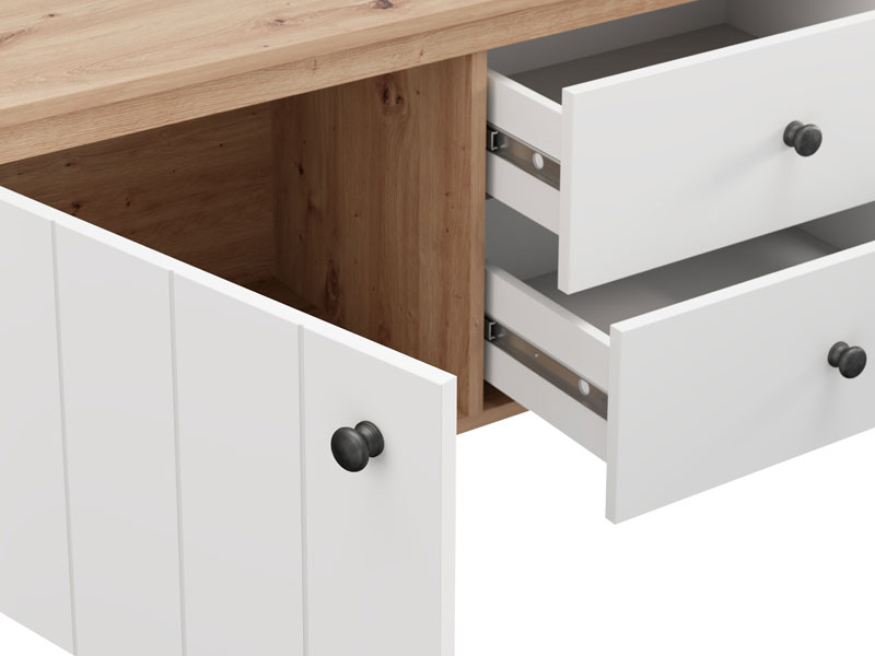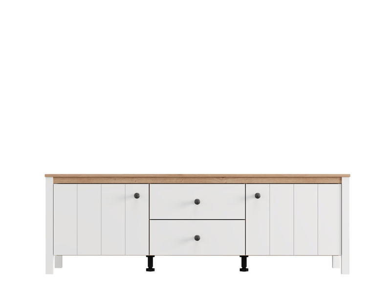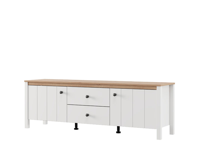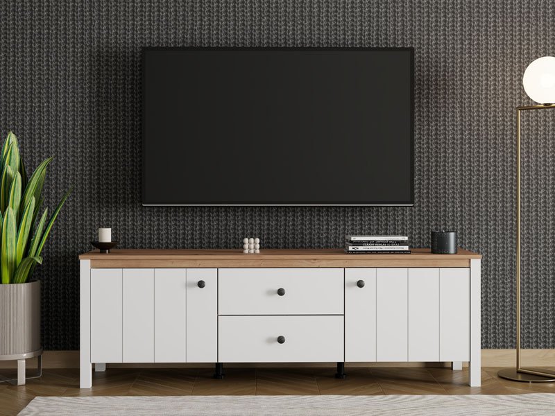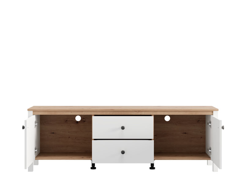 TV shelf BEDFORD TV 162 3K2F2V combines opaque white decor, artisan oak, white matte foil and artisan oak foil to bring warmth, elegance and natural charm to the space. The usable space consists of two closed partitions and two drawers which enable practical and organized disposal of media devices, books and decorative items. TV shelf BEDFORD TV 162 3K2F2V is part of the system of elements BEDFORD, which features a blend of rustic aesthetics and functional, modern design.