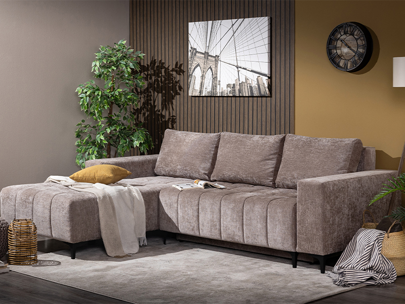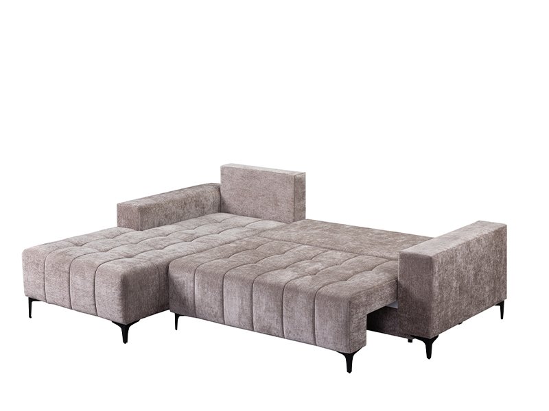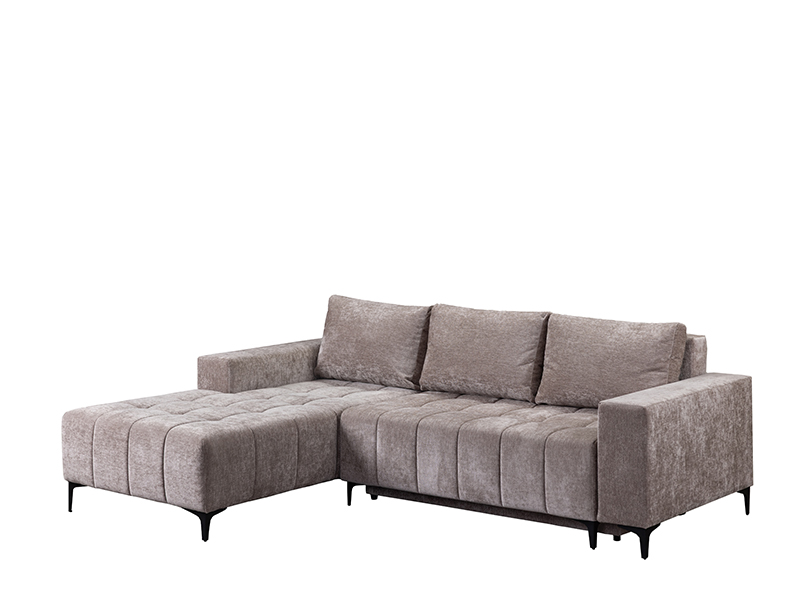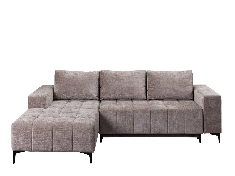 The exact name of the pattern is: textile VIBE 21 brown, corner left. Corner sofa bed BOGOTA features a modern and elegant design, ideal for a modernly decorated living area. With a practical backrest tilting system, it is easily transformed into a bed with a sleeping surface measuring 134x200 cm. It is made of a sponge, providing a good level of comfort in everyday use. The corner sofa bed has one storage box, suitable for storing linens or other necessary items.