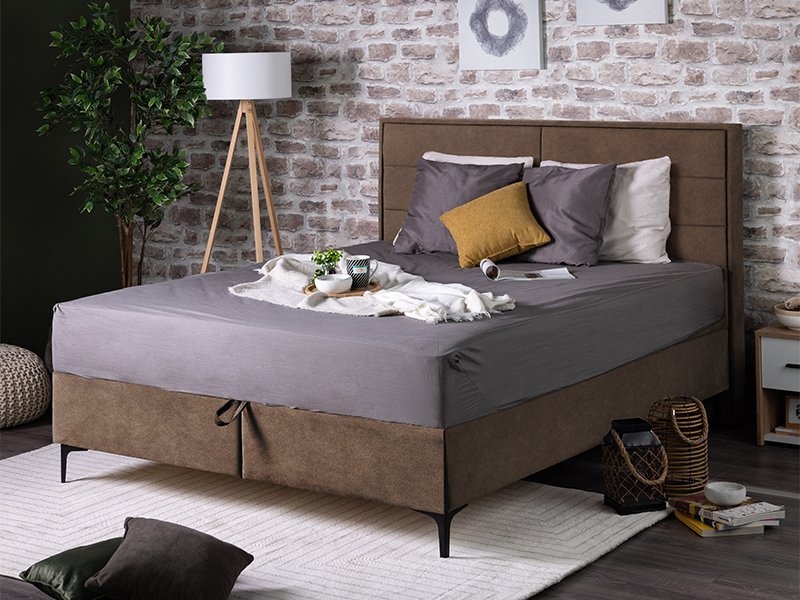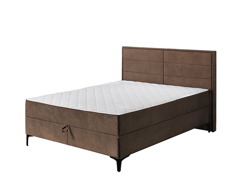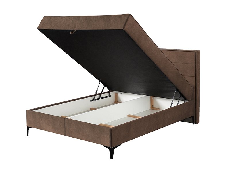 Upholstered double bed model DUE FRAME, in a brown fabric pattern PRESTON 22, is refined with an upholstered frame and headboard, the aesthetics of which are enhanced with studs that contribute to attractiveness. Upholstered double bed DUE FRAME contributes to the creation of a modern bedroom environment and is excellent for fitting in with a wide range of furniture for decorating this environment. This upholsered double bed model has a mattress with a spring core, which, thanks to a scissor mechanism with gas shock absorbers, rises and opens up the space of two spacious boxes for bed linen.