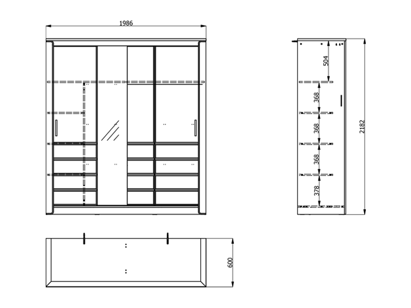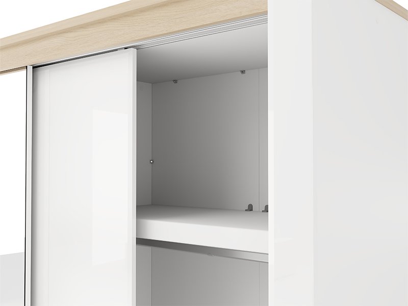 The usable space of the wardrobe consists of two wardrobe rails and one part with partitions, which allows for a tidy and practical storage of the wardrobe. The wardrobe also offers the option of subsequently adding a set of two drawers, further enhancing the functionality of the interior space.