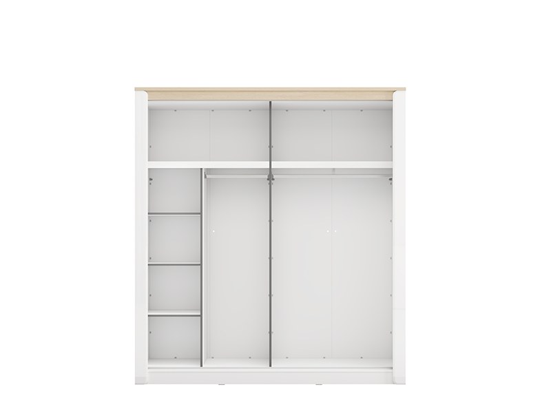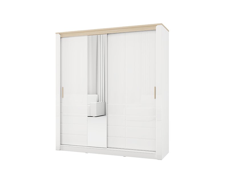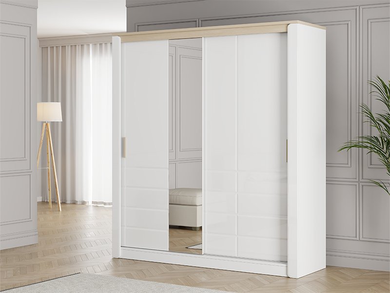 "Wardrobe ABERDEEN 200 OG h217, made in a combination of opaque white, light port oak and white high gloss foil, contributes to the modern and elegant look of the bedroom, emphasizing the contrast of the material and a clearly defined geometric design line. One front of the wardrobe is equipped with a mirror, which further improves the functionality and visually expands the space.