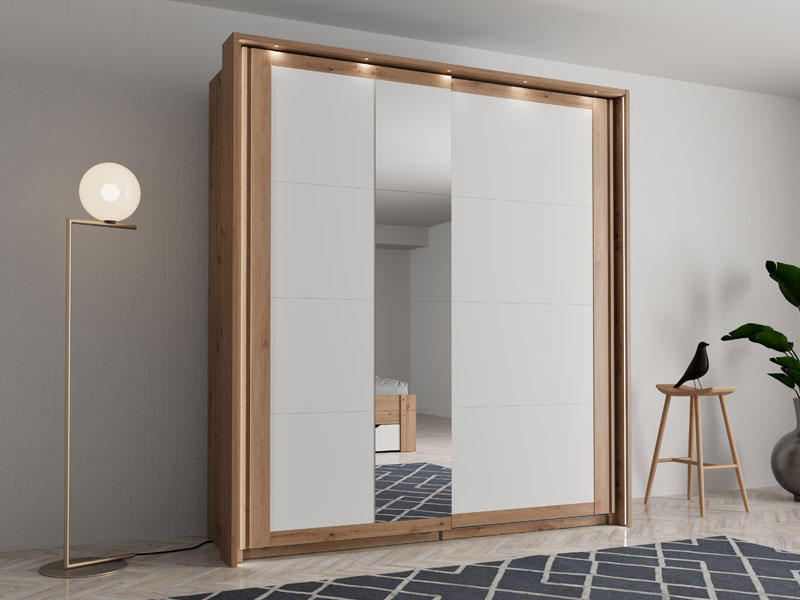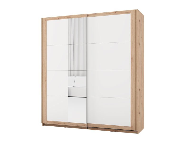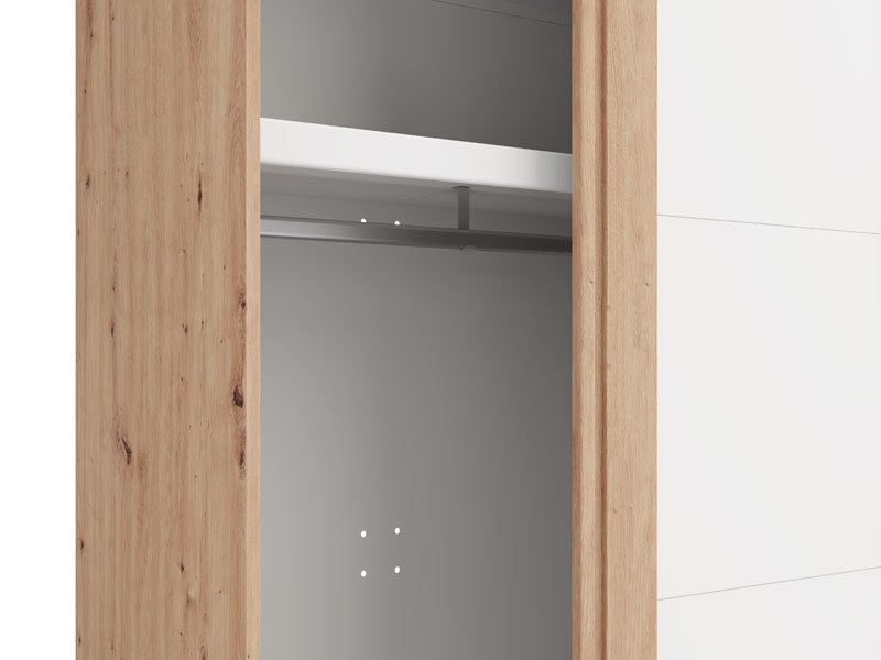 Wardrobe CARTENA 200 OG h217, made in a combination of opaque white decor, artisan oak and artisan oak foil, contributes to the modern and elegant look of the bedroom, emphasizing the contrast and precise geometric form. One front of the wardrobe is equipped with a mirror, which further improves the functionality and visually expands the space.