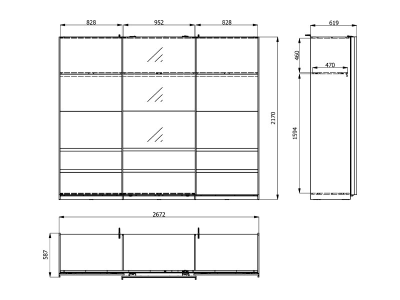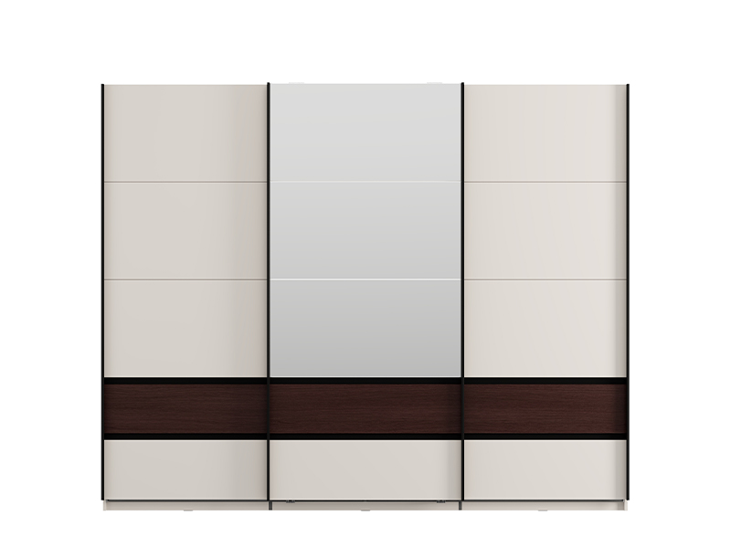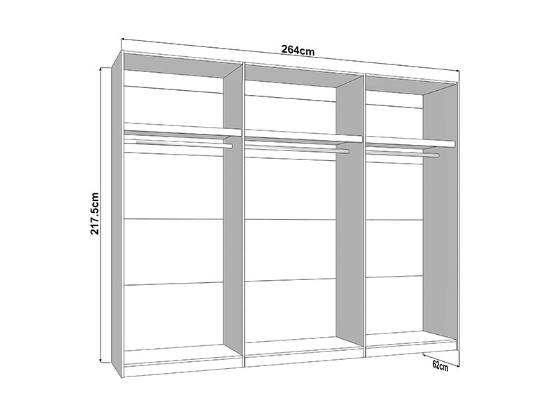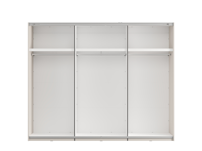 This model has three sliding doors, with the central door equipped with a mirror, which improves functionality and visually expands the space. In its basic form, the usable space of the wardrobe consists of three wardrobe rails, which enable a clear and practical storage of the wardrobe. The