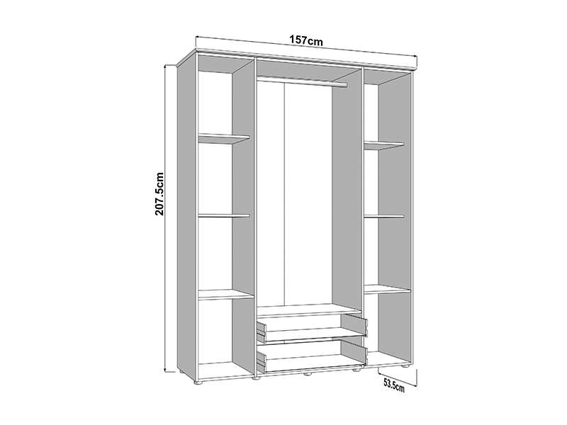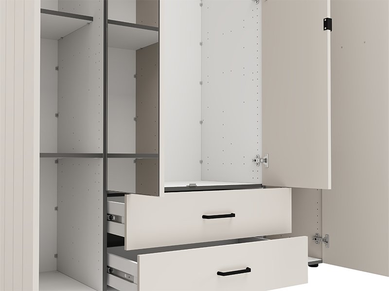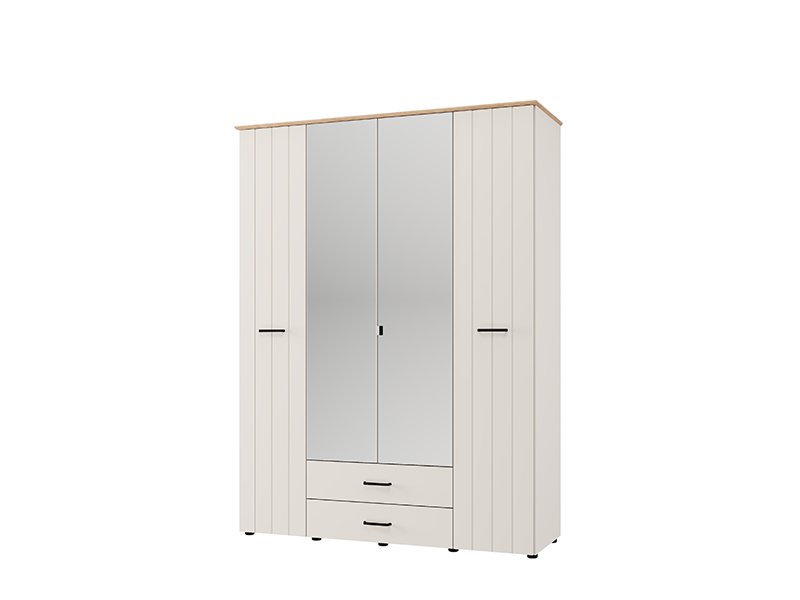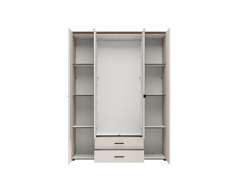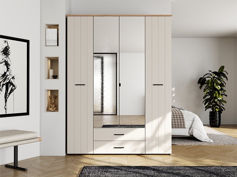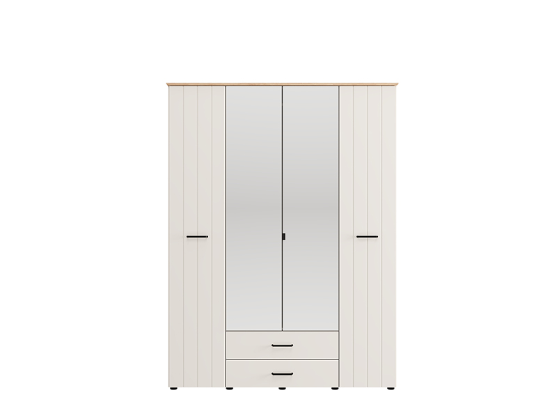 . The four-wing cupboard LAMBETH 4K2F2O h207 is organized so that the central fronts have mirrors, and the usable space in this part contains a wardrobe rail and two drawers below, which allows for tidy and practical storage of clothes and smaller items. The left and right partitions of Cupboard provide additional space for organizing the wardrobe and other items. Cupboard also offers the possibility of subsequently adding a set of shelves, which further enhances the functionality of the interior space.