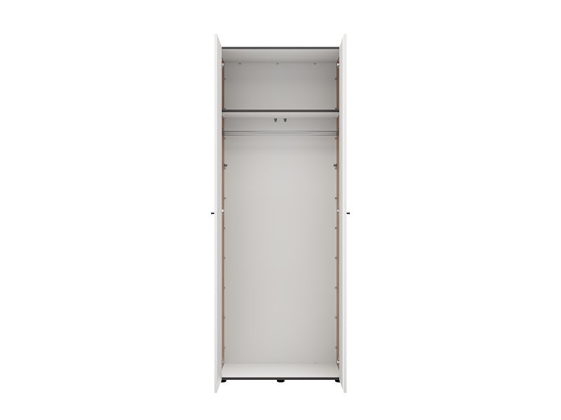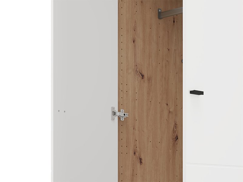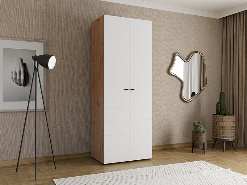 Wardrobe NEVIS 2K h207, in a combination of opaque white and artisan oak decor, is a practical solution for storing your wardrobe. The inside contains a functional use space with wardrobe rail, which enables neat organization of clothing. Modern design and harmonious combination of decor make this model fit easily in different interiors. Wardrobe belongs to the NEVIS collection and can be combined with other models from the same line.