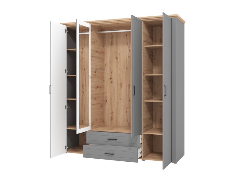 Wardrobe VALENCIA 4K2F2O in a combination of artisan oak decor, graphite gray and gray matte foil, which brings a more subtle, monochrome touch to the space and is a wardrobe model of modern design and great practical use value. The fronts are enriched with black handles of simple design. The interior consists of a segment with shelves in the left and right part, a segment with a wardrobe bar in the middle part, as well as two practical drawers. The benefits of this wardrobe are the functionality and excellent organization of the storage space, as well as the interior mirror.
