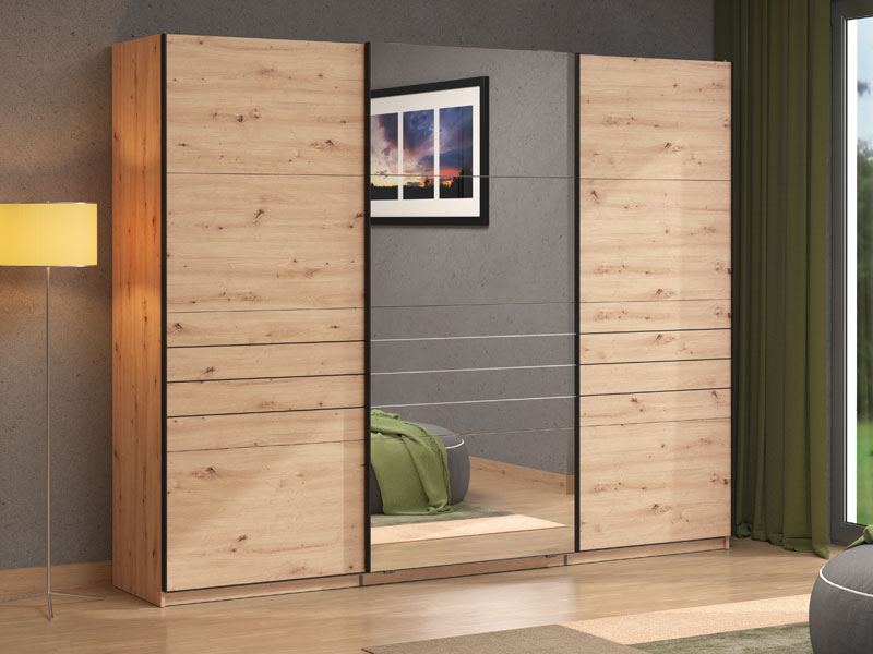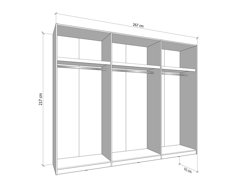 VEYMONT 270 OG h217 Wardrobe with three-panel sliding doors, in opaque white finish and a segment with a mirror on the central front, contributes to interior functionality and aesthetics. It is part of the VEYMONT wardrobe collection and represents an elegant and highly appealing design solution, whose distinct aesthetics contribute to the overall ambience. The usable storage space of this model includes hanging rails and one practical shelf on both the left and right sides. It also offers the option to add a Set of shelves suitable for this wardrobe model or other functional upgrades, as well as the option to install sliding door dampers.