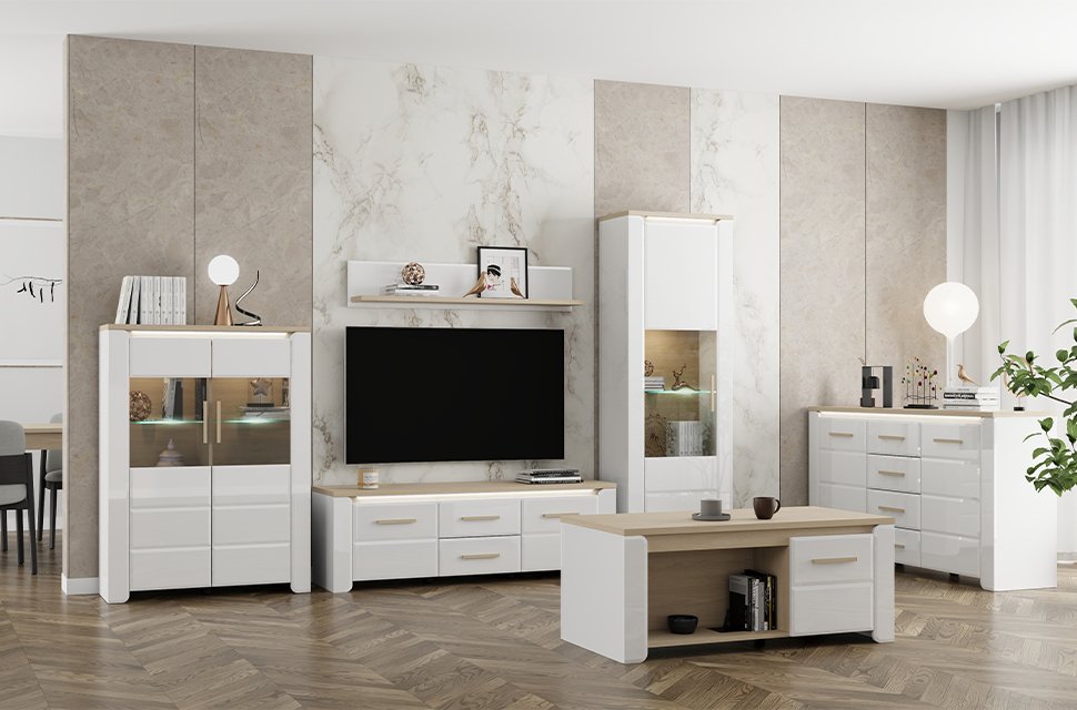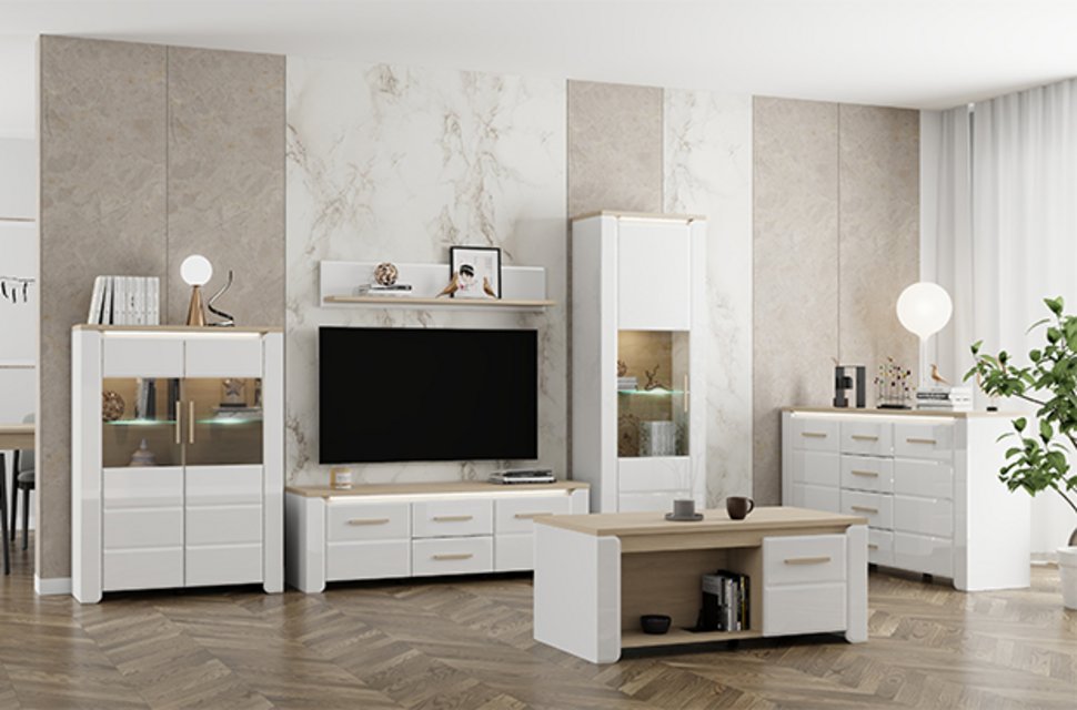 The ABERDEEN living room furniture set offers a modern, simple and exceptionally functional solution for creating a stylish home interior. Its combination of opaque white, light port oak and a white high-gloss foil décor brings an elegance, minimalism and a clearly defined, immaculate design expression to the space.